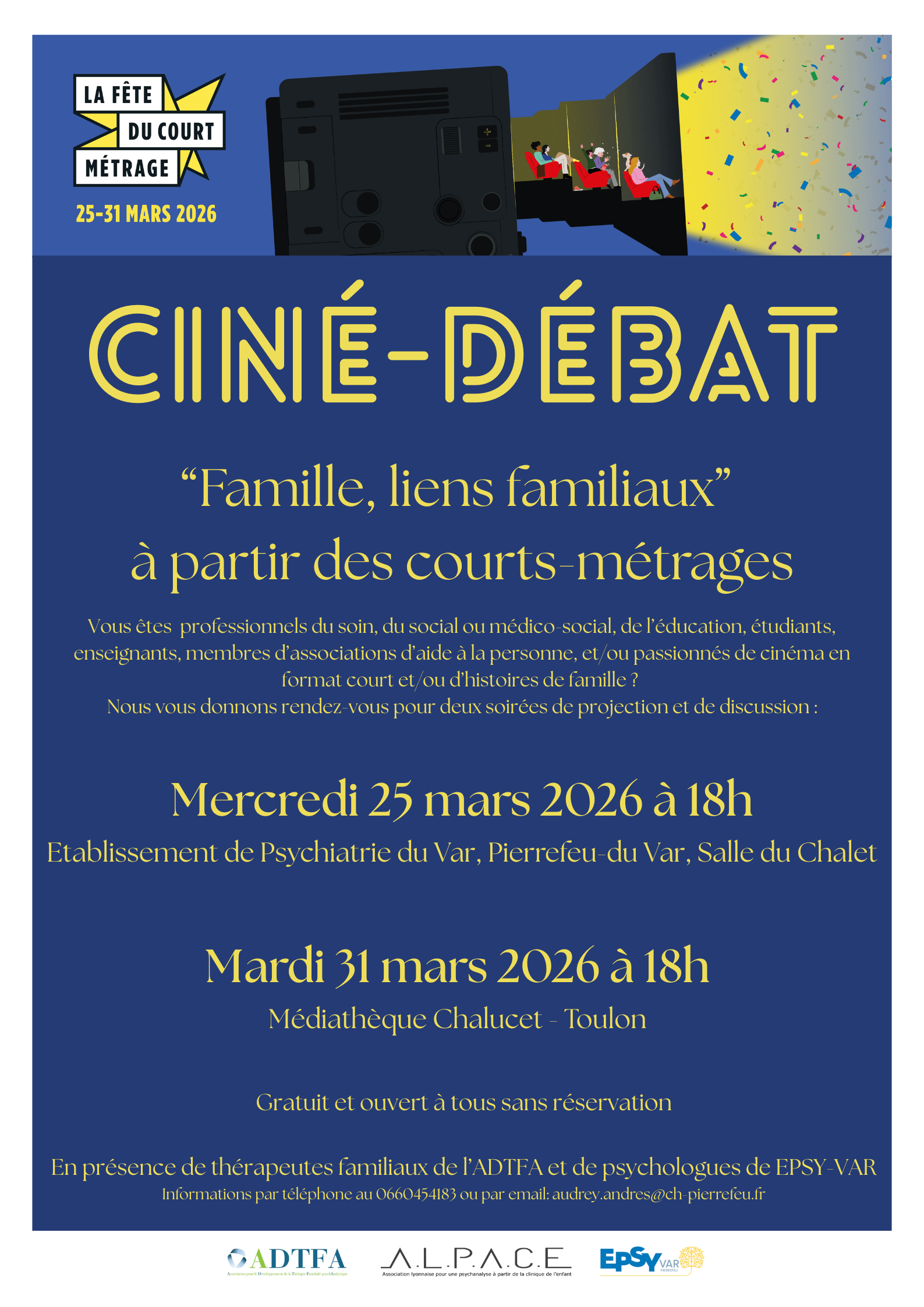 Dans le cadre de la semaine de la Fête du Court-Métrage, nous vous donnons rendez-vous pour 2 soirées Ciné-Débat sur le thème de la “Famille et des Liens Familiaux” à 18h :